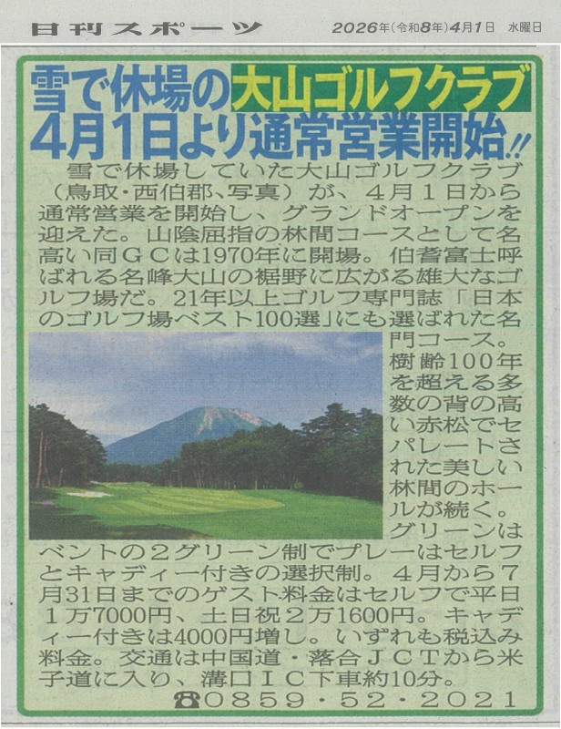 2025年度 (第22回)NEIGHBORS TROPHY TEAM CHAMPIONSHIP 開催コース Informationインフォメーション インフォメーション 新着情報 イベント情報 メディア情報 会員ページ インフォメーション 競技日程 プレー料金 Course-dataコース情報 コース情報 OUT No1 No2 No3 No4 No5 No6 No7 No8 No9 IN No10 No11 No12 No13 No14 No15 No16 No17 No18 Restaurantレストラン Club-houseクラブハウス Accessアクセス Car Air Train Galleryギャラリー Reservationご予約 お問合せ ご予約 Informationインフォメーション インフォメーション 新着情報 イベント情報 メディア情報 会員ページ インフォメーション 競技日程 プレー料金 Course-dataコース情報 コース情報 OUT No1 No2 No3 No4 No5 No6 No7 No8 No9 IN No10 No11 No12 No13 No14 No15 No16 No17 No18 Restaurantレストラン Club-houseクラブハウス Accessアクセス Car Train Air Galleryギャラリー Reservationご予約 お問合せ ご予約 ホーム 新聞記事 Newspaper article 新聞記事 大山・日本海を望み、格調高いハイグレードなプレーが楽しめる。 全て 2026年 2025年 2024年 2023年 2022年 2026.04.01 2026年4月1日日刊スポーツ紙に掲載 イメージ 2025.04.06 2025年春 各スポーツ紙に掲載 イメージ 2023.09.13 2023年9月12日(火)毎日新聞に日本大学ゴルフ選手権・日本女子大学ゴルフ選手権の記事が掲載されました イメージ 2023.05.22 週刊ダイヤモンド誌に大山ゴルフクラブが掲載 2023年5月13日発売の週刊ダイヤモンド誌『プレーしてよかったゴルフ場地域別ランキング』の中国・四国で大山ゴルフクラブが1位になりました。 イメージ 2023.03.23 3月23日デイリースポーツ紙に大山GCが掲載されました。 イメージ 2023.03.23 3月23日スポーツニッポン紙に大山GCが掲載されました。 イメージ 2023.03.17 3月17日サンケイスポーツ紙に大山GCが掲載されました。 イメージ 2021.03.26 3月26日(木)発売 スポーツニッポン紙に大山GC掲載されました。 イメージ 2019.12.03 ゴルフダイジェスト【チョイス】に掲載されました。 ゴルフダイジェスト社チョイス(2019年12月1日発売)の年末伝統企画『日本のベスト100コース』にて17年連続ランクインされました。 これもひとえに、皆様のご愛顧とご協力の賜物と心から感謝しております。 今後ともご来場、ご協力をよろしくお願いします。 イメージ 2019.09.05 週刊ゴルフダイジェスト9月17日号 週刊ゴルフダイジェスト9月17日号に大山ゴルフクラブの記事が載りました。 イメージ 2019.08.10 週刊ゴルフダイジェスト8月20・27日号 週刊ゴルフダイジェスト8月20・27日号に「第3回日本・韓国親善ゴルフチーム対抗戦」の記事が載りました。 イメージ 2019.08.09 8月9日毎日新聞紙夕刊に掲載されました。 7月25日・26日に大山ゴルフクラブにて開催しました「第3回日本・韓国親善ゴルフチーム対抗戦」関連の記事が掲載されました。 イメージ 2019.08.01 8月1日スポーツ紙に掲載されました 令和元年7月25、26日に行われました「第3回日本・韓国親善ゴルフチーム対抗戦」の記事が紹介されました。 イメージ 2019.05.18 原田伸郎のめざせパーゴルフ3 先日収録しました「原田伸郎のめざせパーゴルフ3」の放送予定日ですが6月の毎週火曜日23:00~23:30毎週土曜日11:00~11:30となっております。お見逃しなく!! イメージ 2019.04.20 4月19日サンケイスポーツ紙に紹介されました。 イメージ 2019.03.28 3月28日スポーツニッポン紙に紹介されました。 3月28日発売のスポーツニッポンに大山ゴルフクラブが紹介されました。 イメージ 2018.12.01 ゴルフダイジェスト【チョイス】に掲載されました。 ゴルフダイジェスト社チョイス(2018年12月1日発売)の年末伝統企画『日本のベスト100コース』にて16年連続ランクインされました。 これもひとえに、皆様のご愛顧とご協力の賜物と心から感謝しております。 今後ともご来場、ご協力をよろしくお願いします。 イメージ 2018.11.02 11月6日『いよいよカニの解禁です』 11月2日サンケイスポーツに大山ゴルフクラブが掲載されました。 イメージ 2018.06.28 6月28日スポーツニッポン紙に掲載されました。 イメージ 2018.06.26 週刊ゴルフダイジェストに掲載されました 週刊ゴルフダイジェスト7/10号に記事掲載されました。 イメージ 次を表示